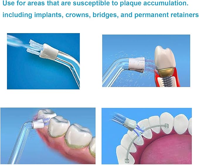 - 【Plaque Removal Tips】 The Tips use for dental areas that are susceptible to plaque accumulation, including implants, crowns, bridges, and permanent retainers