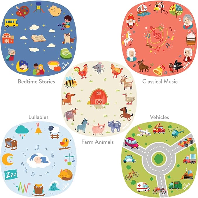 - 5 educational, interactive, magnetic discs (scratch-resistant and washable): classical music, bedtime stories, lullabies, vehicles and farm animals for fun learning (for US customers there's a Christmas disc instead of the classical music disc)