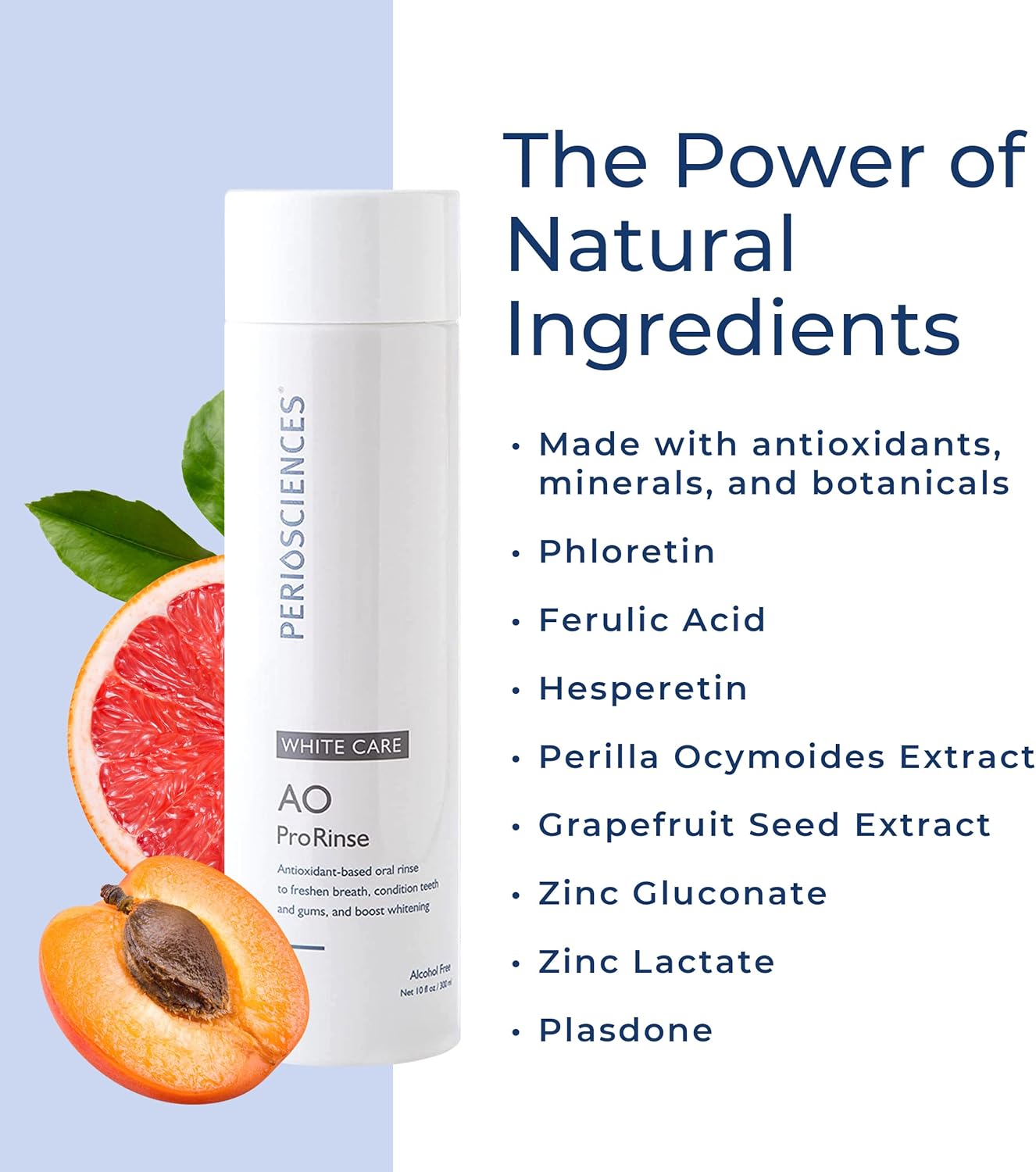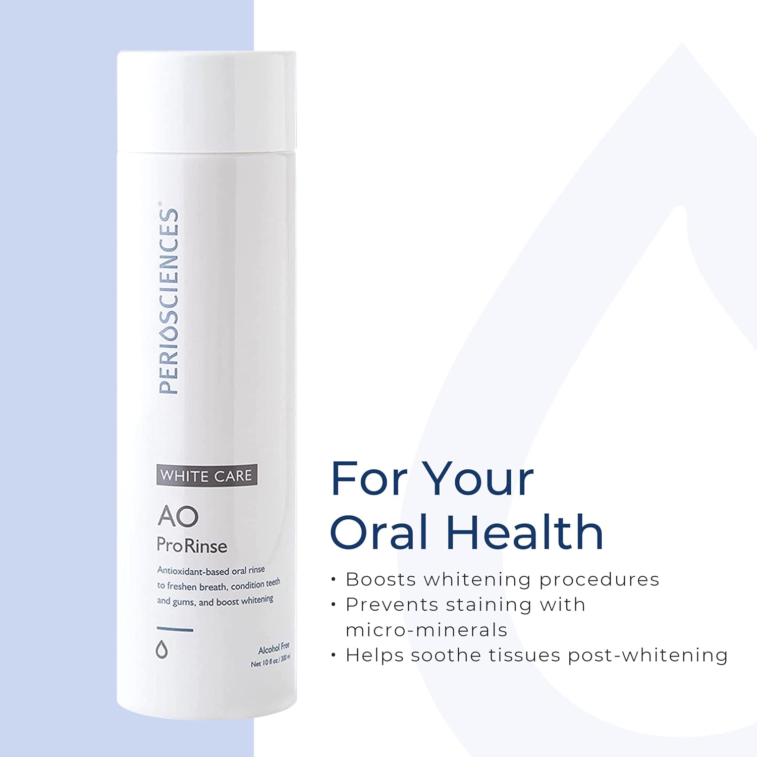 - For your oral health - PerioSciences AO ProRinse White Care Oral Rinse boosts whitening procedures and prevents staining with micro-minerals. This antioxidant-based mouthwash also freshens breath, supports your saliva’s natural defenses and helps calm tissues post whitening.