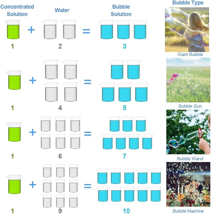• To Get All Kinds of Bubbles: Different proportion will get you different bubbles. For example, 1 cups of water + 2 cups of concentrated solution = bubble solution for Giant Bubbles (for more proportion, please refer to the picture or the product description below).