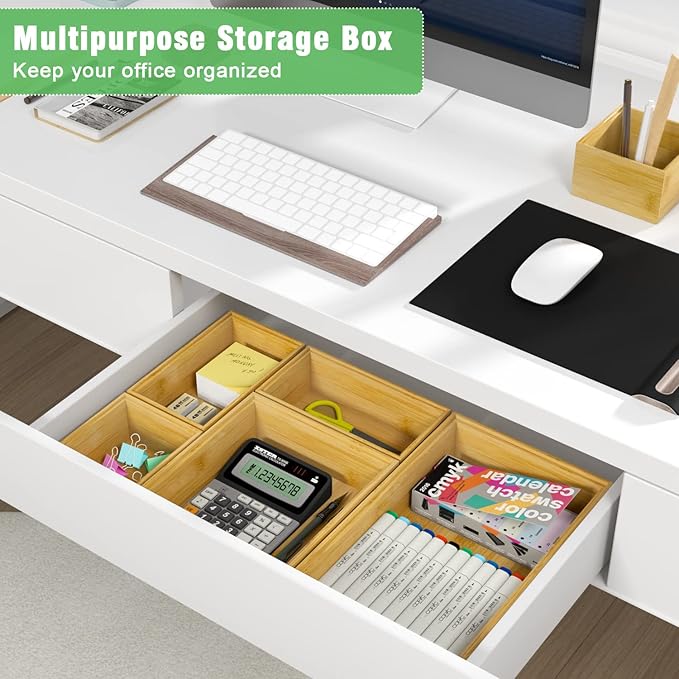 - 【5-Piece Bamboo Drawer Organizer Set】 An ideal deep drawer organizer for multi-purpose Use. Use it in your dresser drawer to organize makeup like lipstick, eyeliner, mascara, makeup brushes and more; Use in your desk drawer to keep pens, paper clips, staples and other supplies organized; Use it in your kitchen drawer to organize silverware, utensil, cutlery, flatware and make your kitchen more neater.