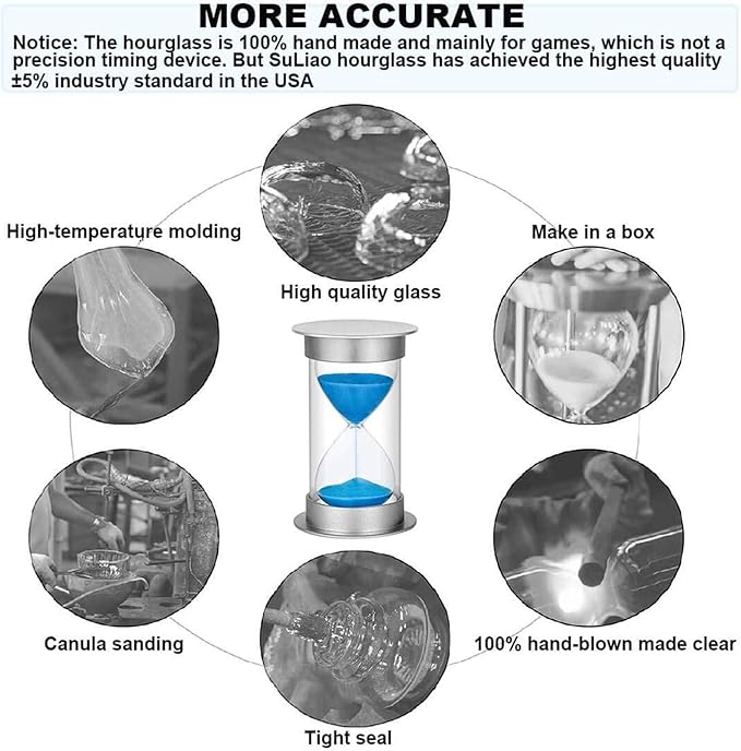 - Notice: This hourglass sand timer is mainly made for games, which is not a precision timing device, so there is time deviation. But SuLiao kids hourglass timer has achieved the highest quality ±5% industry standard in the USA