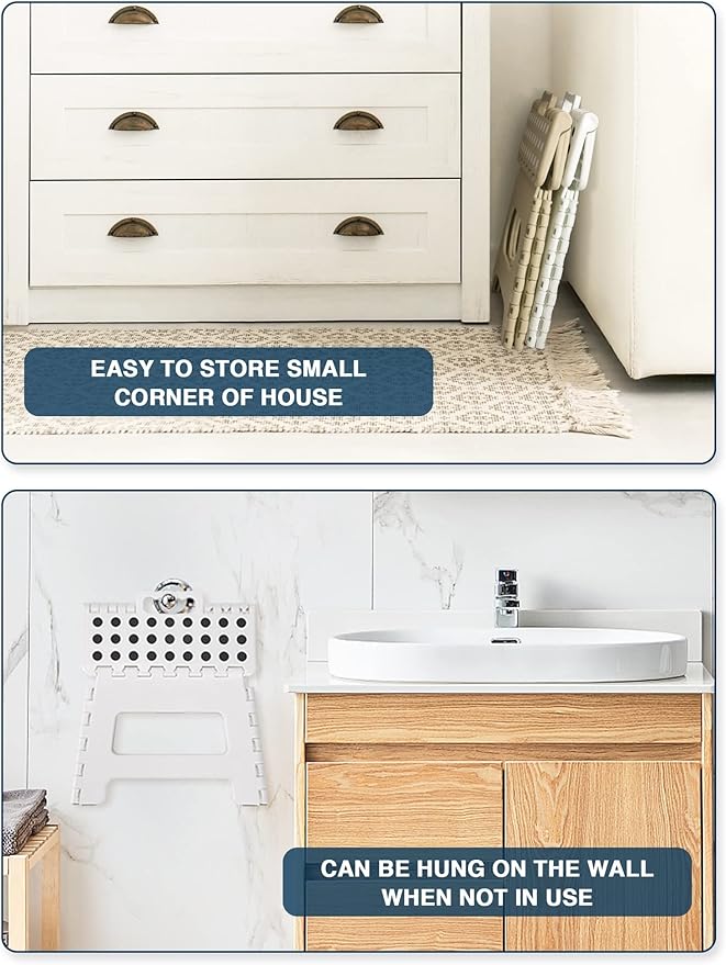 - UPGRADED & CERTIFIED DESIGN SMALL STEP STOOL: Our foldable step stool has been upgraded and certified by EN 14183 requirements, and all our products are completely safe for both children and adults to use. Made to Dyforce standards, this step stool folding is made of tough and durable heavy-duty plastic for long-lasting durability.