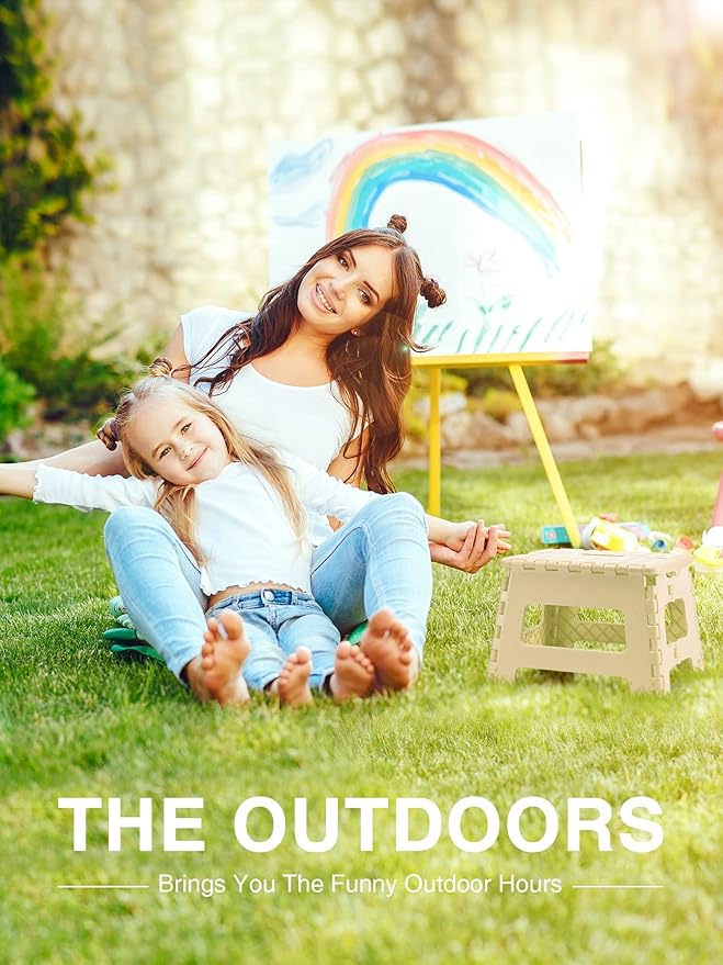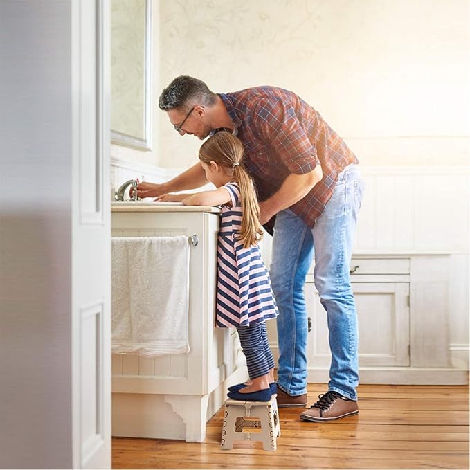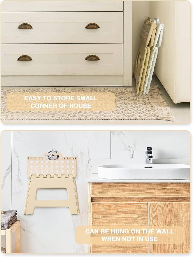 - [Anti Slip Rubber Base] - Special rubber dots on the kitchen step stool surface and anti-slip black rubber strap on each foot for maximum foot grip and gives amazing comfort, preventing slippage. Unique and grip-dot textured surface make the portable step stool safe for everyone. Ideal for Kids, Children and Adults.