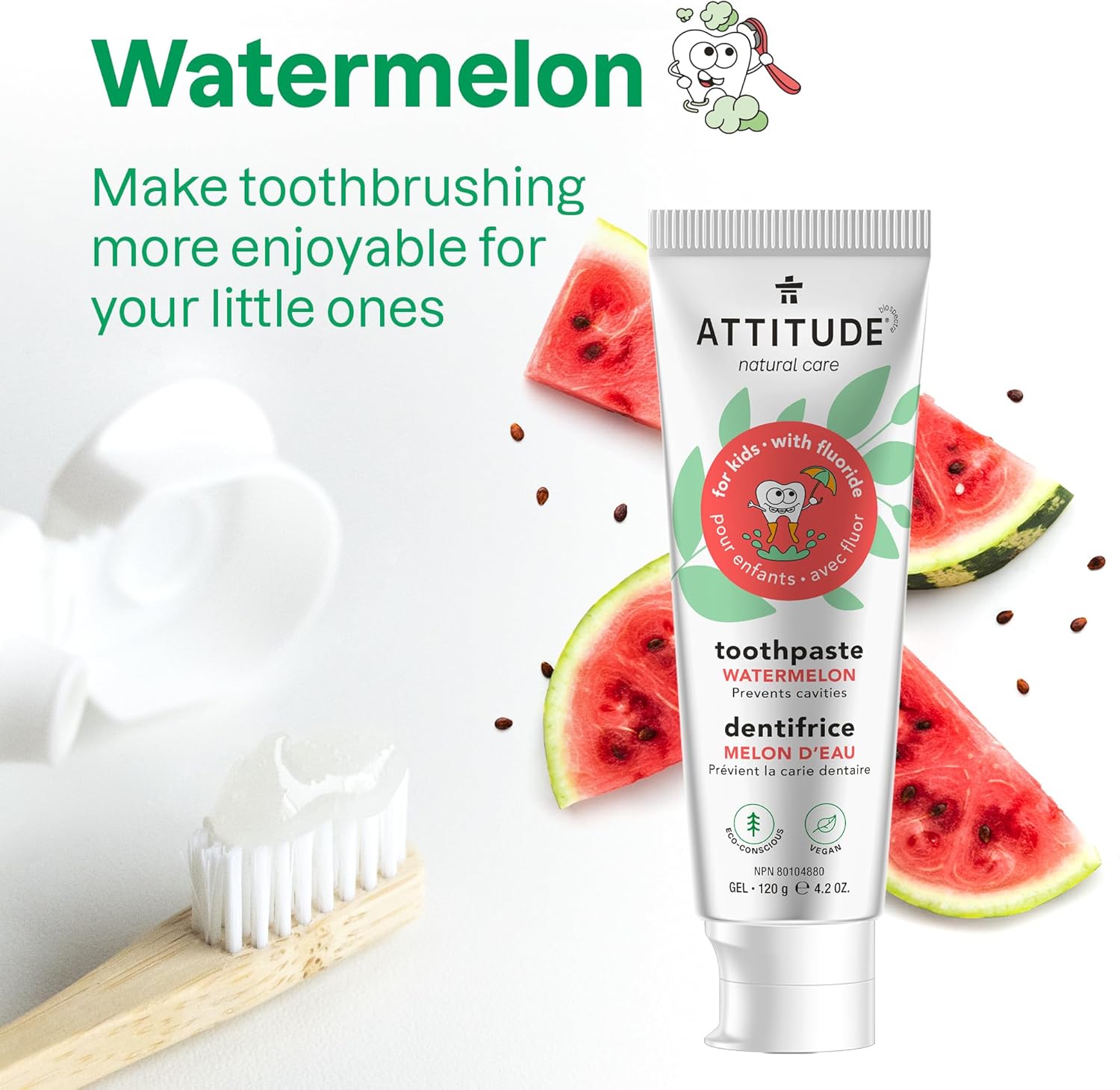 ATTITUDE Toothpaste with Fluoride, Prevents Tooth Decay and Cavities, Vegan, Cruelty-Free and Sugar-Free, Watermelon, 4.2 Oz