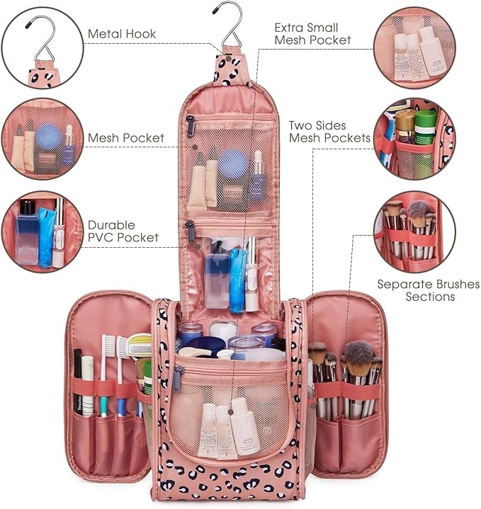 - DETAILS ORIENTED - Buit-in large metal hook allows hanging the toiletry case from towel rack, coat hook or whereever is available, making your toiletries and cosmetics displayed well for easy access, saving bathroom counter space as well. Water-resistent and durable fabric protects your gear from spills. Soft fabric and reliable zippers. Wide opening and rectangle shape makes it easy to stand on its own