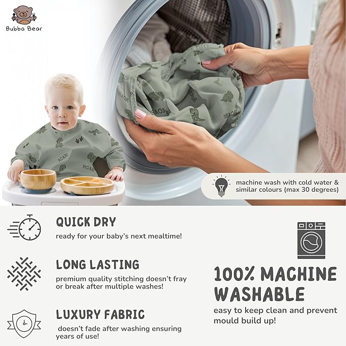 - Full Coverage Protection: Long sleeves and an extended body design keep your baby’s clothes completely protected from spills, stains, and messes during mealtime and playtime.