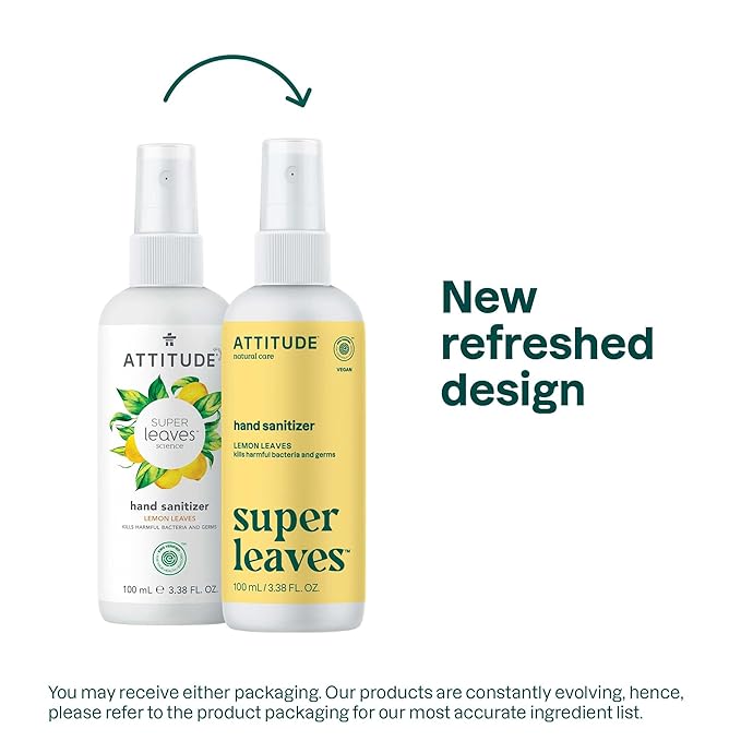 ATTITUDE Hand Sanitizer Spray for Adults and Kids, EWG Verified, Kills Bacteria and Germs, Vegan, Lemon Leaves, 3.38 Fl Oz (Spray Bottle) (Pack of 6)