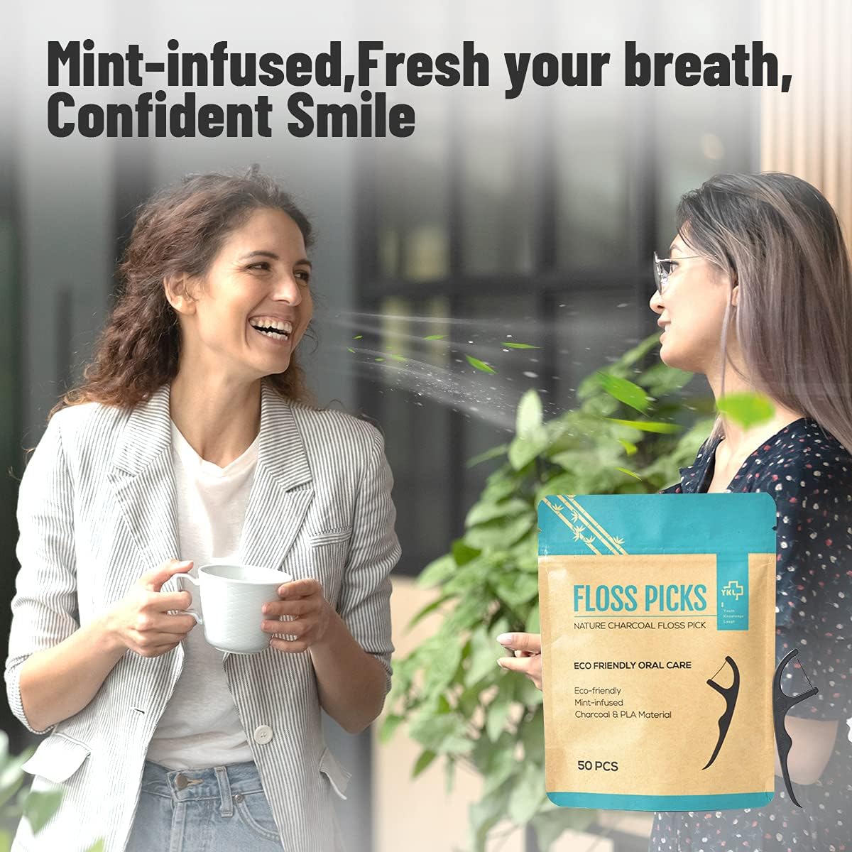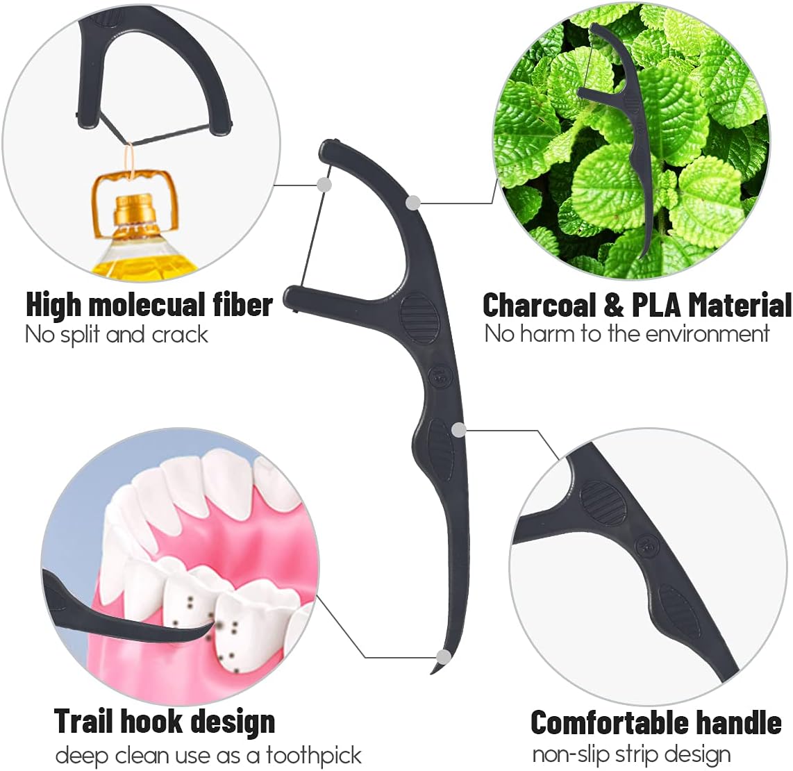 Y-Kelin Natural Dental Floss Picks - Vegan, Eco Friendly Black Bamboo Charcoal Dental Teeth Stick Tooth Pick Toothpick Flosser for Oral Care with a Fresh Feel Minty Flavor (100 Pcs)