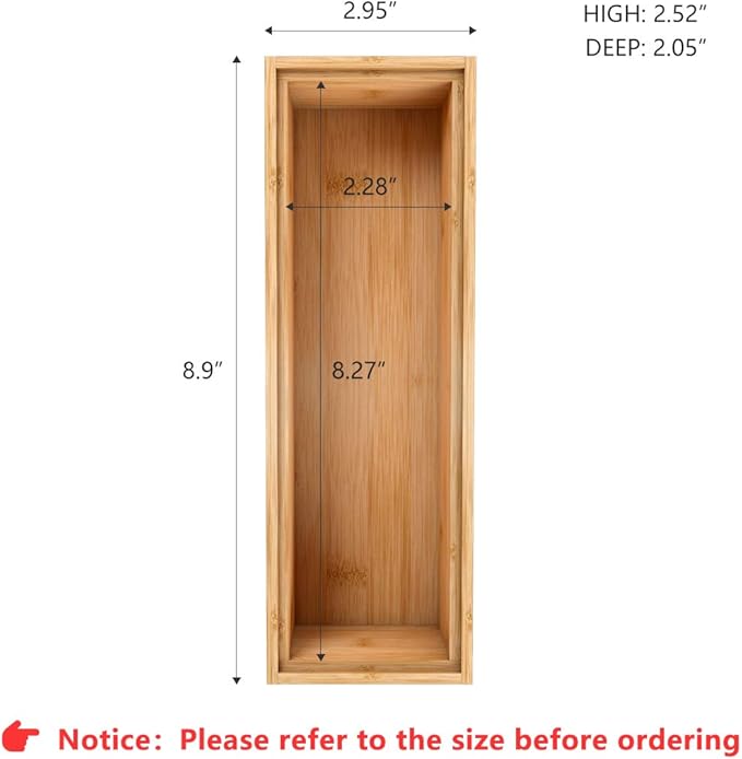 - 【2.5" High Storage Box Organizers】 The height of Bambloom drawer organizer is up to 2.5 inch, which gives more space to storage item like sponns, knife or other little things. Its deep compartmentments make it a practical storage box for drawers. (PLEASE NOTE: Please measure your drawer/space before ordering. If you want the boxes to fit a specific space, allow a little breathing space for any small variations in size that may result during manufacturing.