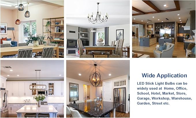 - Wide application:led stick light bulbs lights up instantly and brighten up any space, 2700K (Soft White), 120V, 200¡ã beam angle. E26 Light bulb Ideal for your home, office, school, hotel, market, store, garage, workshop, warehouse, industrial pendant lighting etc.lightbulbs 60w led base fit a standard E26 socket.