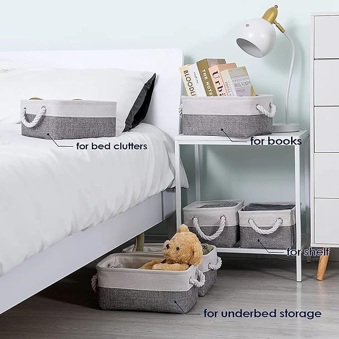 - With modern and stylish design, our storage baskets combine both of the decorative and practical forms. All of our baskets are made of fabric like cotton, linen. They are stylish, sturdy and reusable. These small storage bins can be a beautiful and functional accent to any room. They are not only household life good helpers but also charming decorations