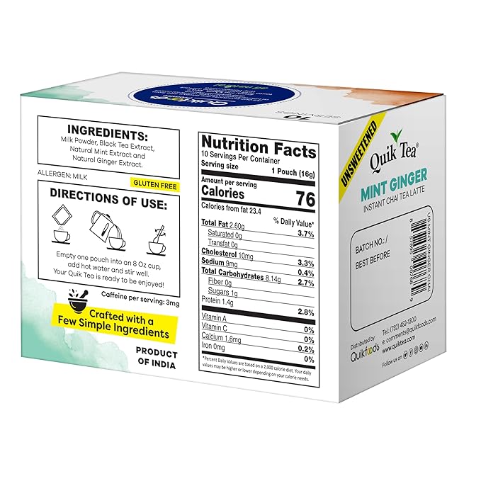 QuikTea Mint Ginger Unsweetened Chai Tea Latte – 10 Count, Bold Mint Ginger Flavor, Naturally Caffeine-Light, no preservatives, No Sugar Added – Just Add Hot Water