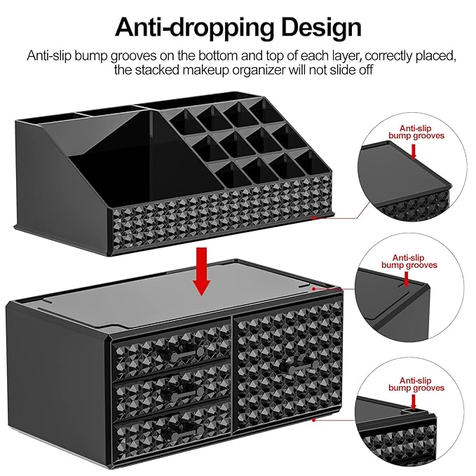 - 3 Stackable Makeup Organizer and 8 Detachable Drawers---Awenia storage containers are stackable, vertical storage will save a lot of space. You can use them side by side or use separately.Put your small objects on top of acrylic organizer to make your countertop space more tidy. 8 Detachable Drawers with different sizes for sorting makeup brushes, eyeshadow palettes, skincare bottles, and compacts.