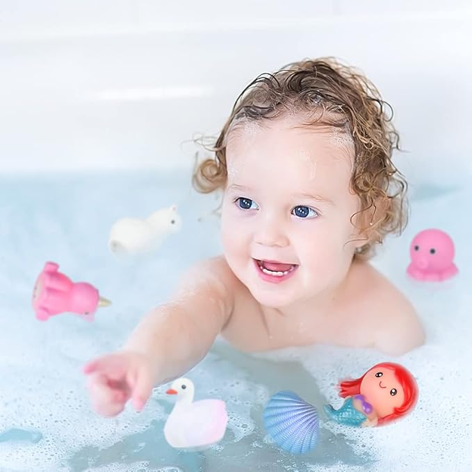 - Valued Bath Toys Set : What a cute Ocean Sea Animal Flashing Bath Toys!Bright colors and lovely images!6 packs light up bathroom toys have 6 different type and color! include all the fantasy elements you want: mermaid, unicorn, flamingo, alpaca, shell, pink octopus!Perfect size fits to babies little hands!