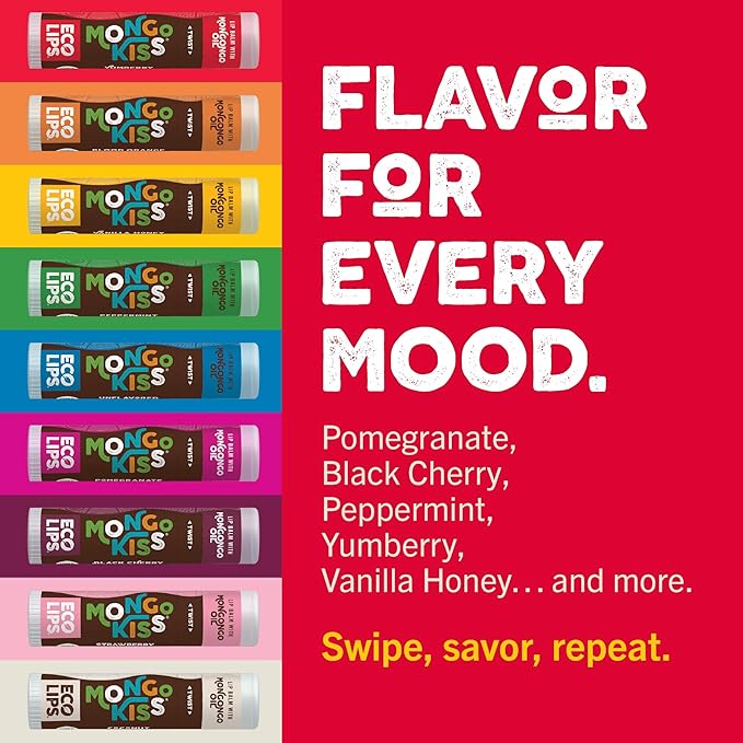 Eco Lips Mongo Kiss Organic Lip Balm 4 Pack Peppermint, Pomegranate, Vanilla Honey, Black Cherry - 100 Percent USDA Organic - Soothe, Moisturize Dry, Cracked and Chapped Lips - Made in USA