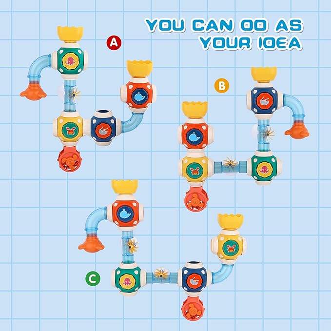 - POWERFUL SUCTION CUP&PERFECT GIFT: Our pipe splicing bathtub toy is equipped with 6 powerful suction cups. You can install the suction cup on a bathtub or a smooth wall (you need to wipe the wall before use to prevent the suction cup from falling due to dust).