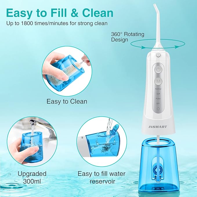 - [4 Clean Modes with Memory Function]: INSMART cordless oral flossers teeth cleaner has Normal, Soft, Pulse and DIY modes for choosing with Low-noise Design, which can meet various oral needs. Preset mode before use and the innovative Memory Function helps keep on with your preferable mode for next use even if the portable water dental flosser has been turned off.