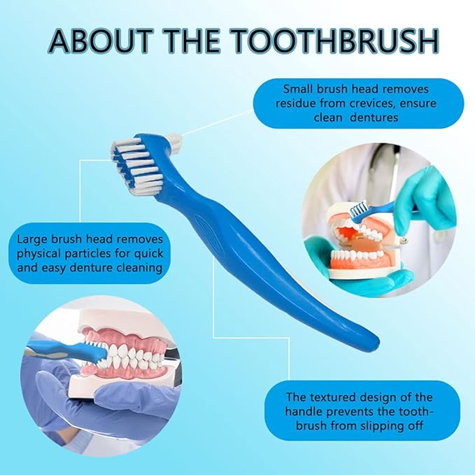 - TOOTHBRUSH AND BOX -- The double-headed toothbrush design can clean your dentures in all aspects. The toothbrush box prevents dust and is also convenient for you to take when going out. It will be easy to clean dentures anytime and anywhere.