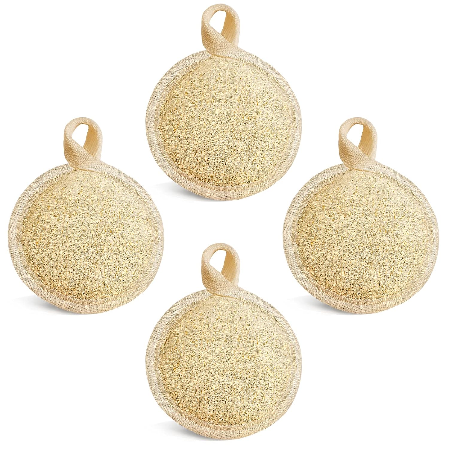 - [SIZE DESCRIPTION] Packed in a kraft environmentally friendly carton, a box of 4 pieces, 3.15in diameter round loofah pads with flexible contour fits your face contour, light and flexible is a travel necessity and the best gift for friends and relatives.