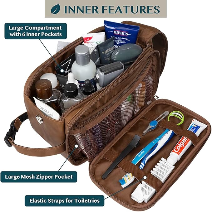- WATER RESISTANT TOILETRY BAG DOPP KIT: This toiletry case kit is made from high density PU leather with added side padding for durability and extra protection to keep your toiletries safe and protected during travel. The lining is water-resistant to prevent liquid splashes from entering the bag or luggage. The toiletry bag also offers excellent wet/dry separation so you can keep wet accessories in a separate compartment from dry toiletries during camping, road trips, weekenders.
