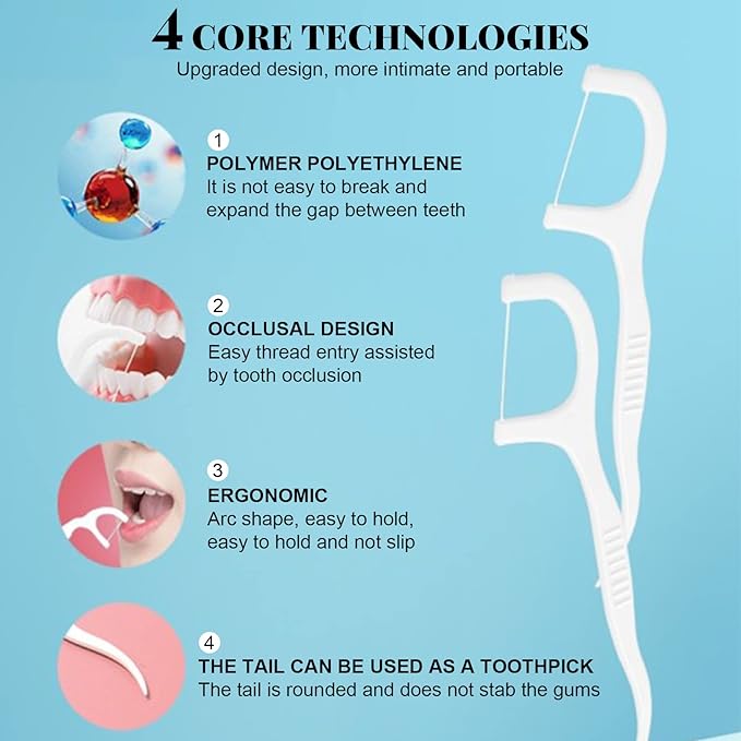 - 2-in-1 Function Design:Dental floss can remove excess residue, remove plaque that the toothbrush cannot reach, and keep teeth clean. It can also be used as a toothpick.The middle part adopts a convex design to enhance the hand feeling and save effort and protect the teeth.