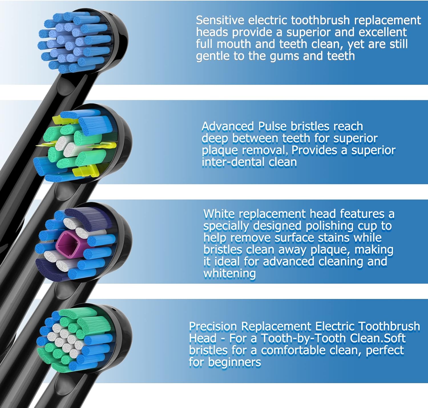 - Electric toothbrush replacement heads with 4 functions-4 * Action Floss, 4 * Precision, 4 * Sensitive and 4 * 3D-Whitening. Use your new replacement brush head to work hard to create healthy teeth and a white smile. Each brush head has a color code ring for personal identification for household use.