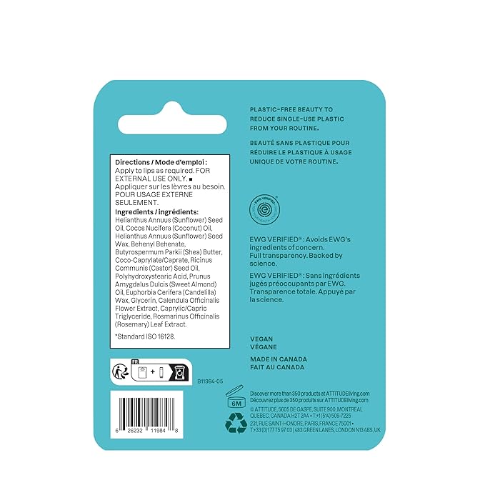 ATTITUDE Lip Balm, Natural Origin, Nourishes & Protects, Shea Butter, Coconut & Castor Oils, EWG Verified, For Dry Lips, Men and Women, Vegan, Unscented, 0.3 Oz