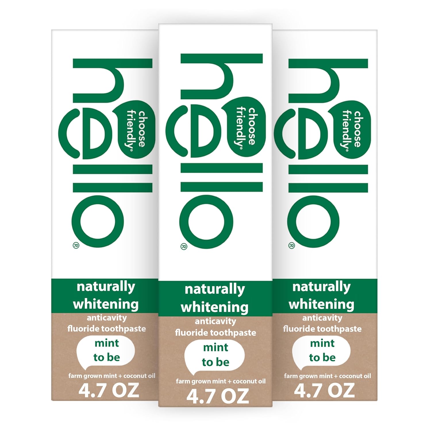 hello Naturally Whitening Fluoride Toothpaste, Natural Whitening Toothpaste with Coconut Oil and Tea Tree Oil, Tames Bad Breath, Helps Moisturize, and Fights Cavities, Mint, 3 Pack, 4.7 Oz Tubes