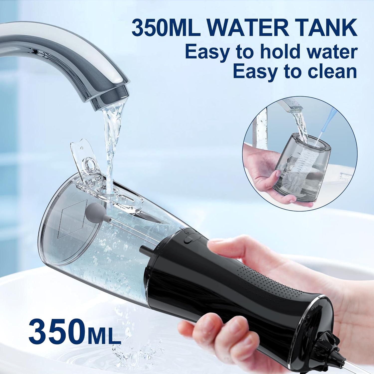 - 【350ML Big capacity & IPX7 Waterproof】Yes, With 350ml water tank! don't need to refill water multiple times.Our water dental flosser can take more water than other portable flosser in the market. The removable water tank is easy to clean. Water dental flossers picks owns internal water leak-proof design, Mocel oral irrigator prevent water leakage reliably, It can use for shower in the bathroom and it's washable to clean (Make sure the rubber base cover is closed tightly )