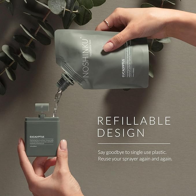 Noshinku - Refillable Hand Sanitizer Eucalyptus 3-Pack, Travel Size Spray with Hydrating Botanical Oils, Natural Ingredients, All Natural Fragrances, Sugarcane Derived Alcohol, No Parabens, No Dyes