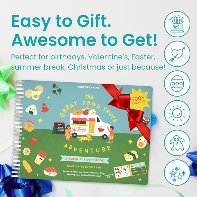 - Gifts for kids: The food-loving child in your life will jump for joy when opening this gift! Grandparents love our Mom and Dad-approved learning activity books for boys and girls and all the entertainment they bring. Food truck stickers are great rainy day activities and make the perfect gifts for birthdays, holidays, Montessori classrooms, and for make-believe enthusiasts ages 4-8.