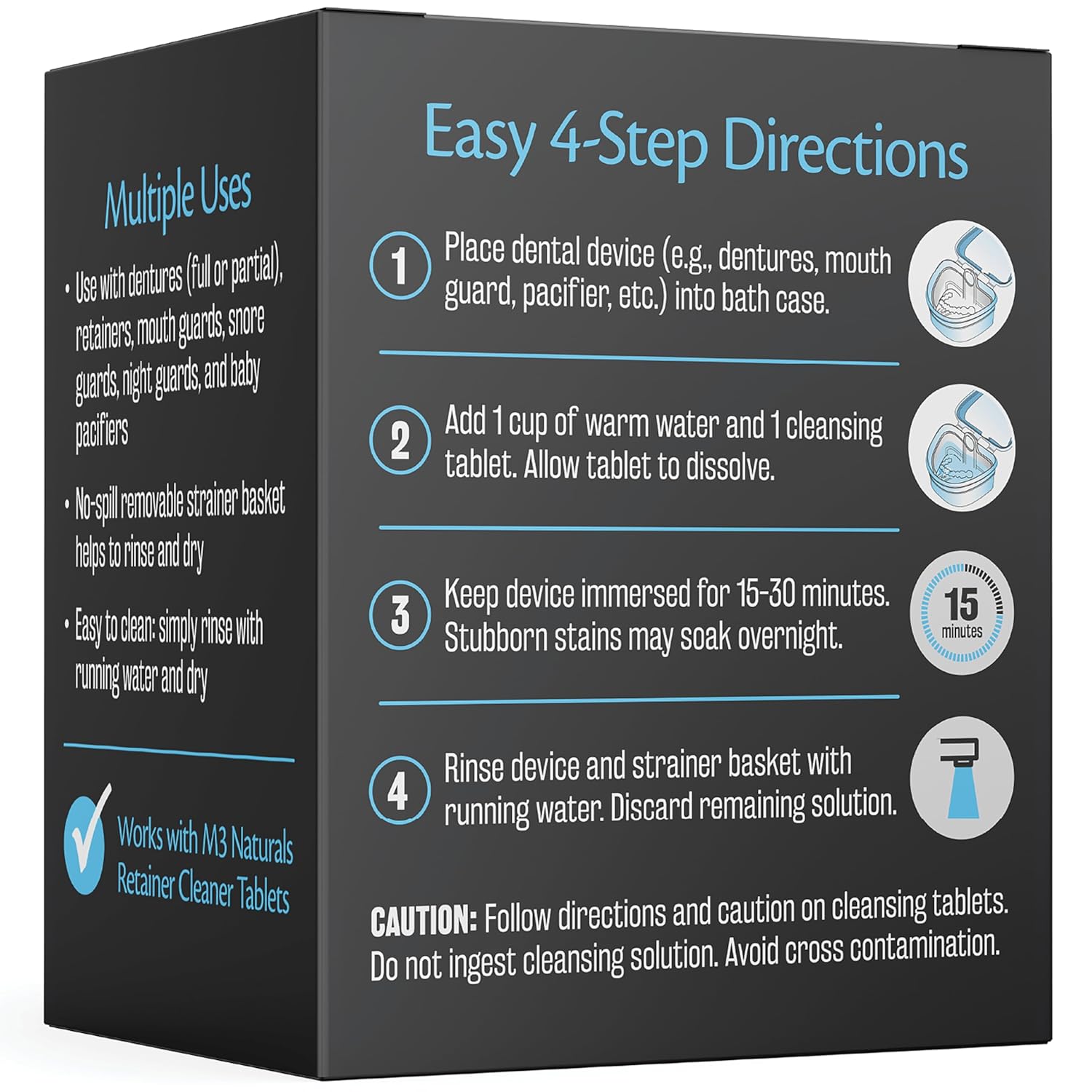 - Durable & Spill-Free. Our denture cups for soaking dentures will last. Thanks to the strong double hinge design, this retainer cleaning case is both functional and durable. The inner basket lifts out of the dental bath so that your dental appliance cleaning process is easy and hygienic. M3 Naturals is a brand that contains products that contain natural ingredients and other ingredients. However, all M3 items are quality tested in the USA with the highest standards.