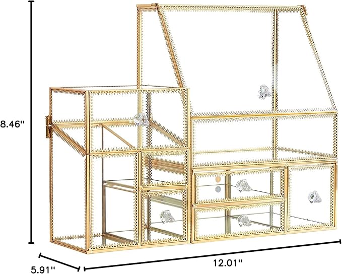 - Premium Durability — Made of durable toughened glass ,Shatter -resistant ,Double layer plating and Handmade — — Drawers slide open smoothly with easy grip handles — Can be used alone or to complement other organizers — Makeup NOT Included — Measures approximately Trapezoid+3slot drawer :21.5 L x 15.5W x 30.5H CM(8.5L*6W*12H inches)/ Brushholder :14L*8.5W*19.3H CM(5.5L*3.3W*7.6H inches)
