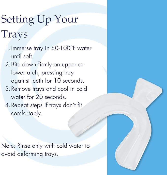 - Steps for Tray Molding for Custom Fit: 1. Immerse tray in 80–100 degree (F) water for about 15 seconds to make mouthguard soft. (If tray does not soften you may need to increase temperature of water) 2. Once soft, remove the tray from the water and place on your teeth (upper and lower arch) and bite down firmly 3. While maintaining a firm bite, use your fingers to press the tray tightly against your teeth for 10 seconds 4. Remove tray and place in cold water for 20 seconds to set 5. If your tray does not sit comfortably over your teeth, you can repeat steps 1–4 until it is suitable 6. To maintain your tray, rinse with cool water