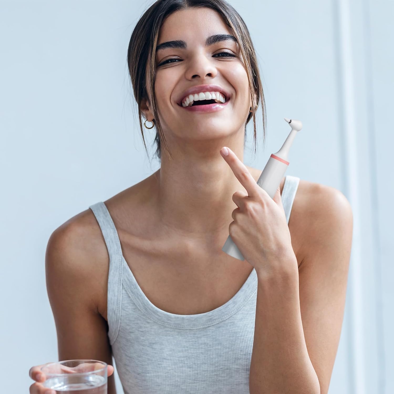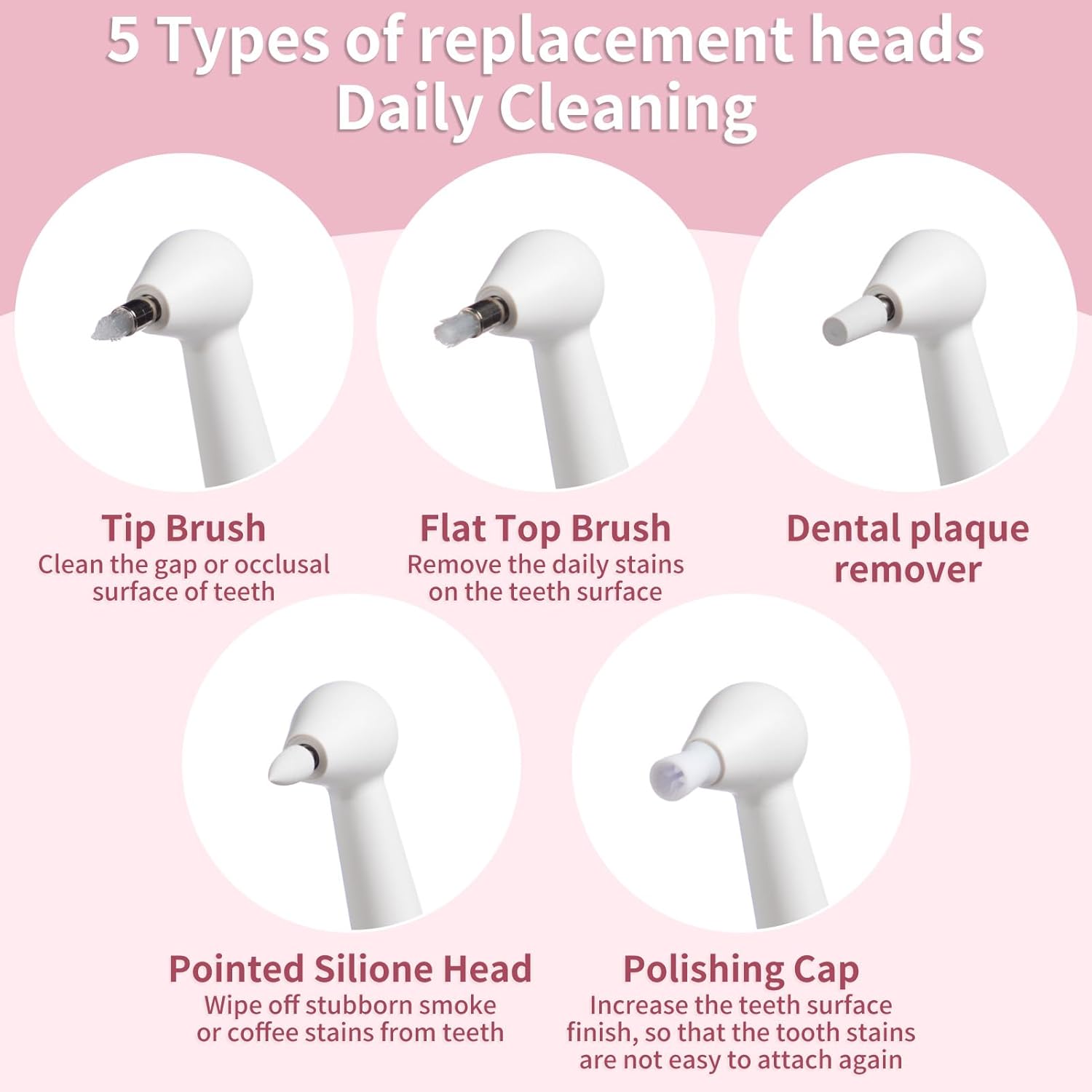 - 8 Replacement Heads- Equipped with 5 different soft polishing tips: 2 silicone brush head, cleaning massage cup, flat brush, pointed brush. Unique design, easy to remove stubborn stains on the teeth, flat stains, interdental stains, improve the smoothness of the teeth to make the teeth smoother and shiny