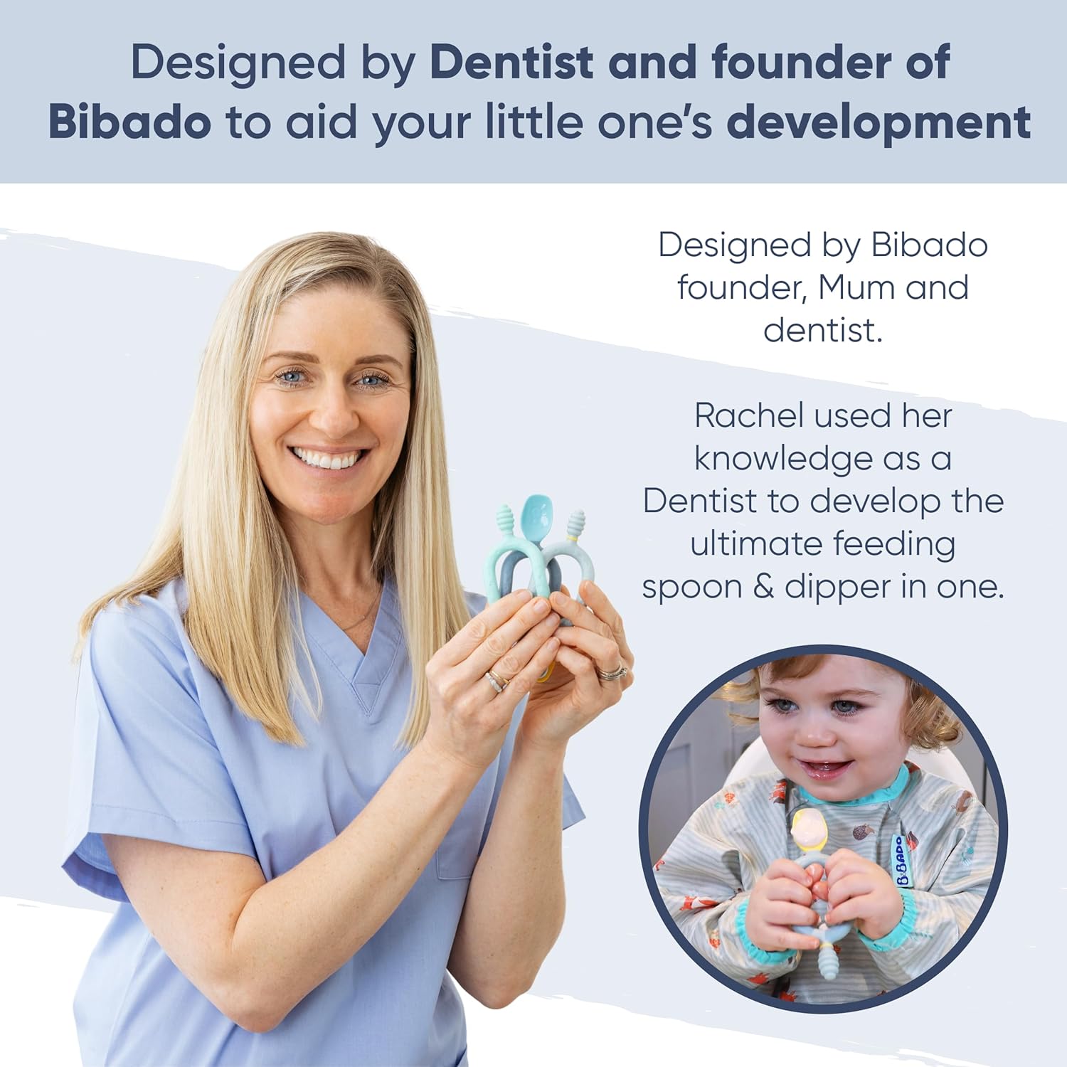 Bibado - Dippit Baby Spoon and Dipper, Green & Grey (2-Pack) - Soft, Chewable Dipper & Deep Spoon - Two-Hand, Sensory Grip - Toddler Utensils - Baby Led Weaning Supplies - Baby Essentials - 6 Months+