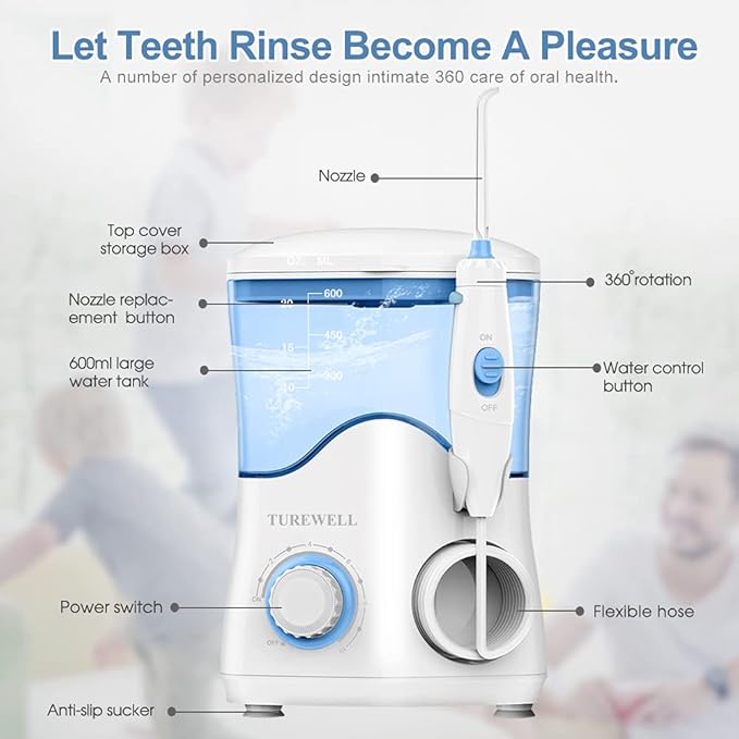 TUREWELL FC162 Water Dental Flosser for Teeth/Braces,10 Pressure Levels, 8 Water Jet Tips for Family, 600ML Electric Water Dental Oral Irrigator for Teeth Clean (White)