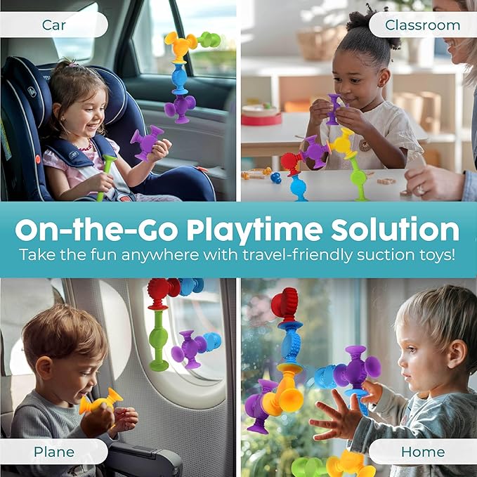 - Take Them Anywhere - Stimulate young minds and spark creativity when connecting and building amazing creations in the bath, at home, in the car, on airplanes and more! Easily portable in a convenient carry bag, you can take our suction toys everywhere - keeping your children entertained no matter where you are!