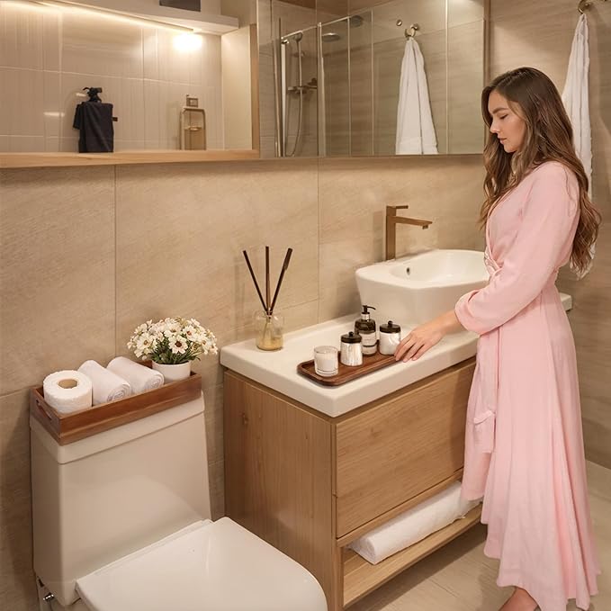 - Perfect Size: Ensure that the top of your toilet tank is large enough to accommodate the wooden basket which measures 15” L x 6.1” W x 3” H, or the vanity tray which is 12” L x 5” W. Please measure the toilet space where you want to place this decorative set before purchasing it to ensure a perfect fit and an organized appearance. It will be the ideal size for a bathroom countertop, keeping your cosmetics, accessories, shampoo, oral care products, and daily essentials in order.