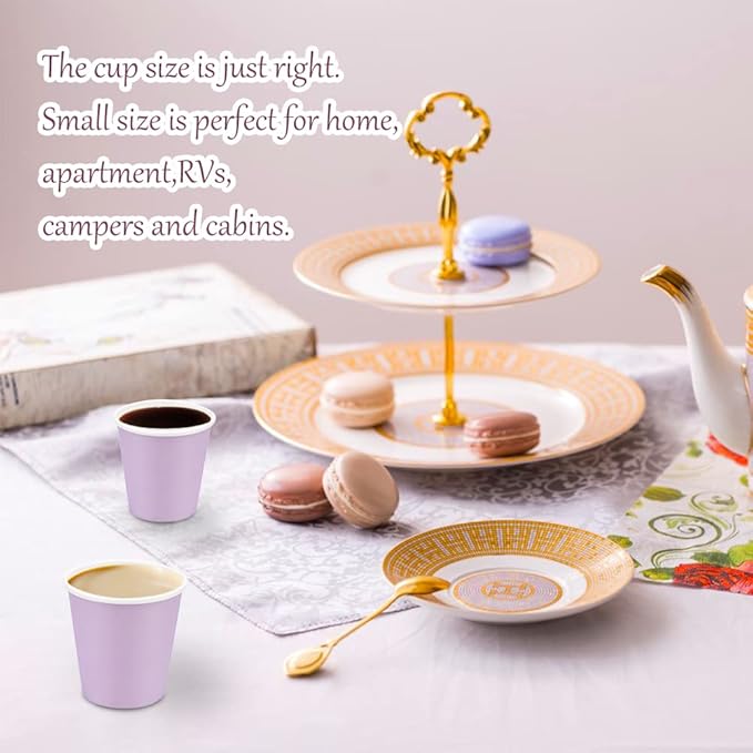 - Softly Sophisticated Hue: Adorned with a soothing lavender shade, these cups introduce a gentle pop of color to any setting. Perfectly sized at 3 ounces, they effortlessly enhance the ambiance, whether used as disposable espresso cups for a精致 coffee break or for savoring small delights.