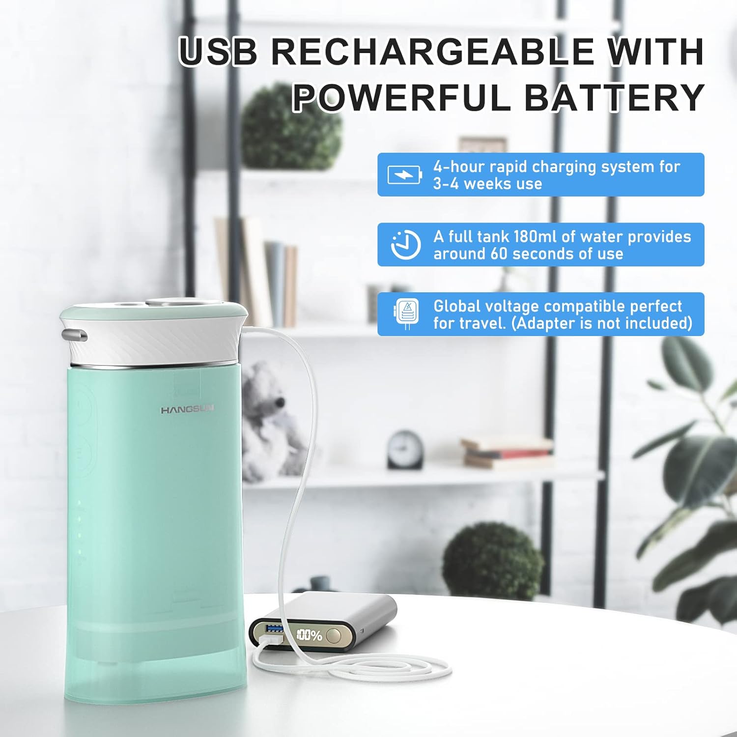 - Rechargeable, Waterproof and Portable Design - The electric flossers features a 4-hour rapid charging system for 3-4 weeks use, 60 seconds of water capacity. IPX7 waterproof and can be used in the shower. Global voltage compatible perfect for travel. (Adapter is not included)