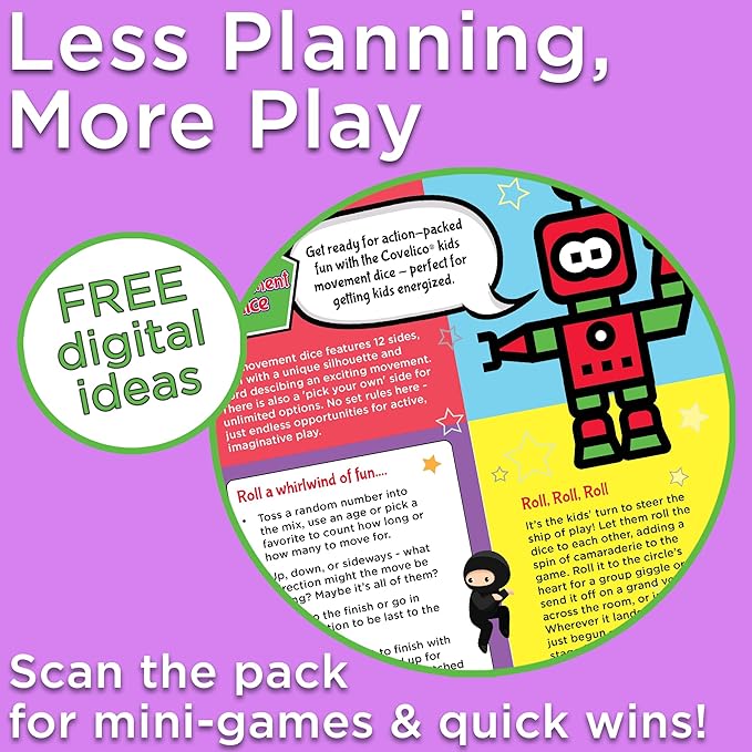 - SCREEN-FREE ACTIVE FUN: The bright green Covelico movement dice is a soft 12-sided fitness dice / exercise dice for kids with 11 action prompts (chug, zoom, spin, crawl, tiptoe) that turn movement games into play—great preschool movement toys for home, playground, indoor pe classroom, and outdoor kids games.