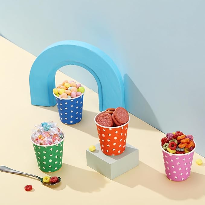 - Ideal for Bathroom Use - Assorted Colors disposable paper cups with cute stars patterns are easy to attract attention. Compared with white paper cups, bright colors let you feel happy and decorate your home or party.500 packs paper cups bulk can be used for a long time. NOTE: If the cups stick together, you can rotate the stacked cups by hand to solve the problem