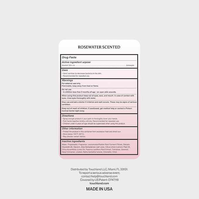 Touchland Glow Mist Revitalizing Hand Sanitizer Spray, Rosewater scented, 1FL. OZ. Travel Size