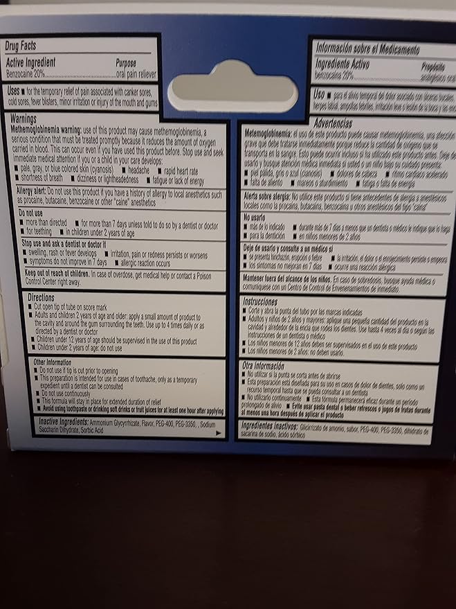 - Benzocaine Oral Gel: The toothache gel contains 20% benzocaine oral gel which is a highly effective active ingredient that gives precise and instant relief for oral discomfort and toothache pain caused by dentures or sores.