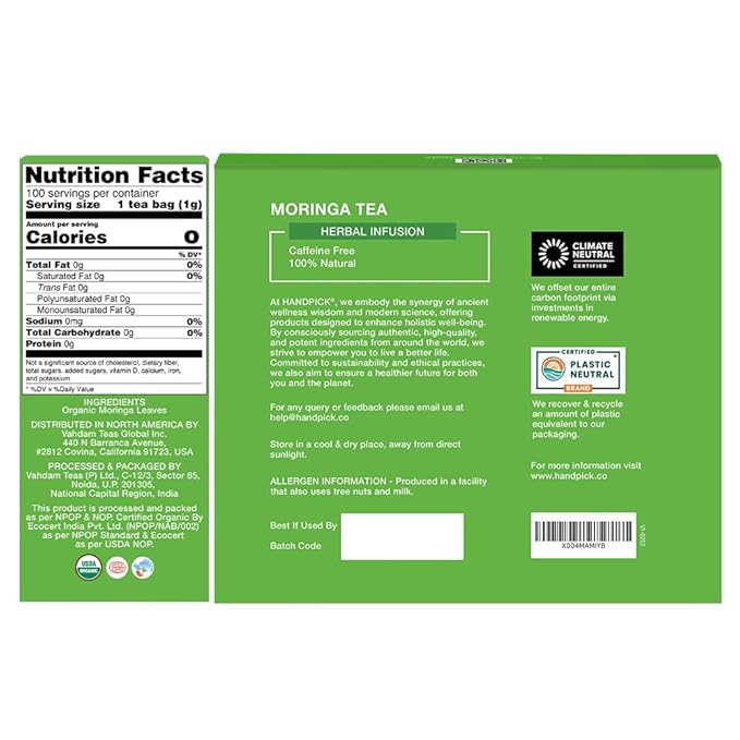HANDPICK, Organic Moringa Tea Bags (100 Count), Pure Moringa Leaves | Authentic Indian Origin | Caffeine Free, Non GMO | Earthy, Light & Refreshing | Round Eco-conscious Teabags