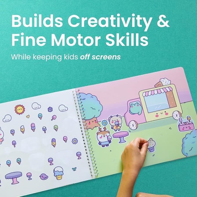 - Learn through play: Kids build fine motor skills, explore spatial awareness, and strengthen hand-eye coordination as they peel and stick stickers onto colorful scenes! Engaging in conversations about the sticker book characters will help imaginations run wild & encourage make-believe and pretend that can foster bonds between you and your child. Go ahead - play on!
