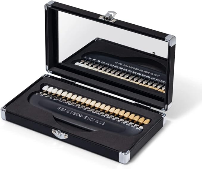 - 【High Quality】 The Tooth Color Card comes in a stylish, easy-to-store, portable, mirrored aluminum box inside with mirror. The sturdy box can protect the tooth comparison color card, and there is a mirror in the box, which is convenient to open the mirror at any time to compare.