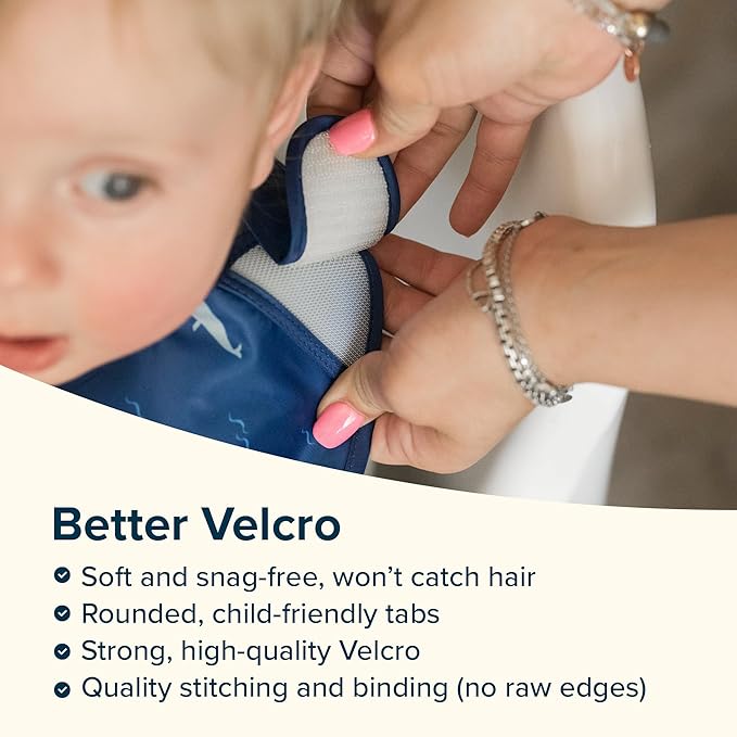 - MESS-PROOF MEALTIME: Our mess-proof baby food bibs feature a deep catch-all pocket that captures crumbs and spills, keeping clothes and tables clean. Made with lightweight, water-repellent fabric, these waterproof bibs make everyday meals simpler and cleaner.